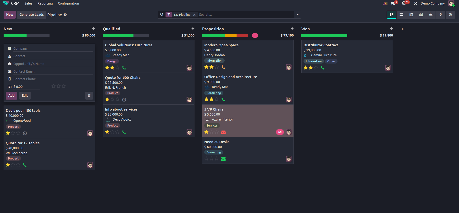 Quickly create and link a new contact to its company directly from the Kanban card when adding a new lead.